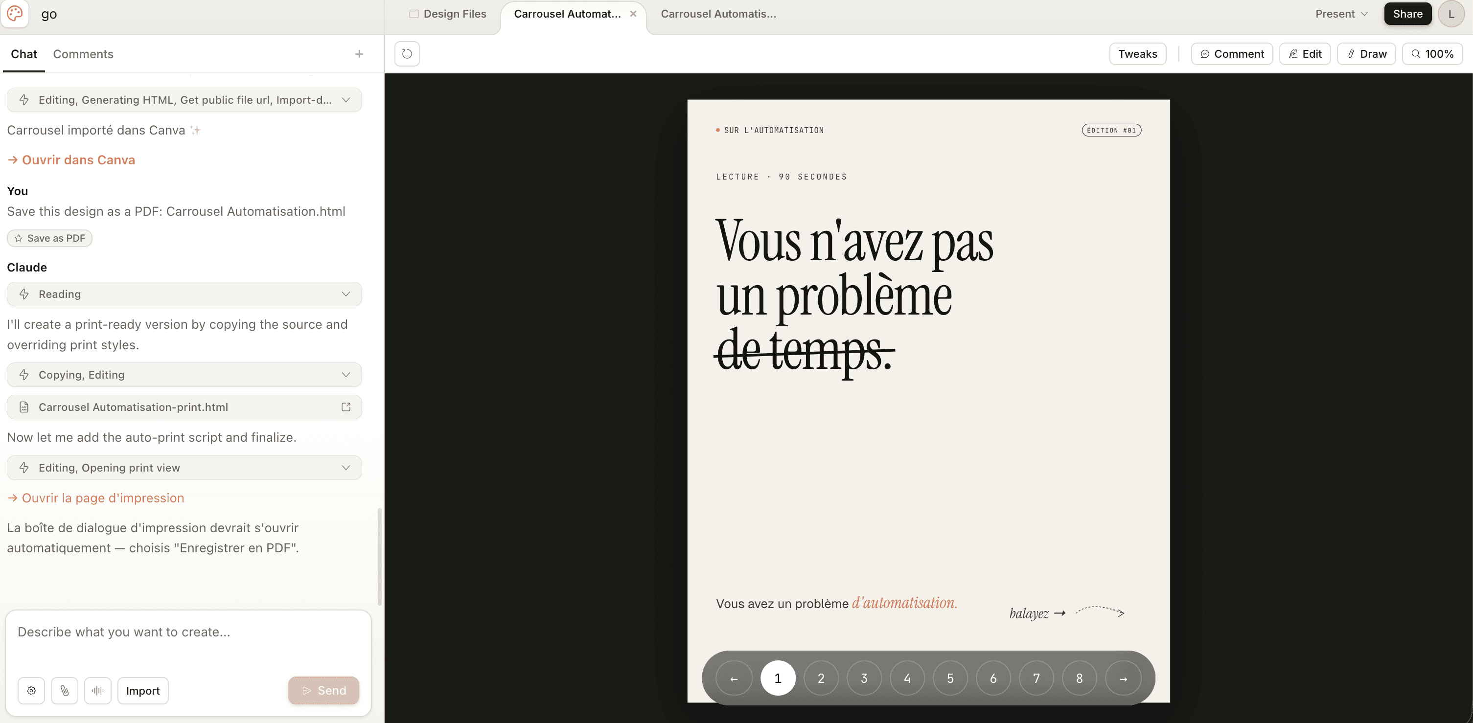 La différence avec Canva pour les carrousels, c'est que Claude Design gère à la fois le copywriting et le design. Vous n'avez pas besoin d'écrire le texte puis de le mettre en forme : Claude fait les deux en même temps. Et si vous avez configuré votre Design System (j'en parle plus bas), chaque carrousel respecte automatiquement votre charte graphique.