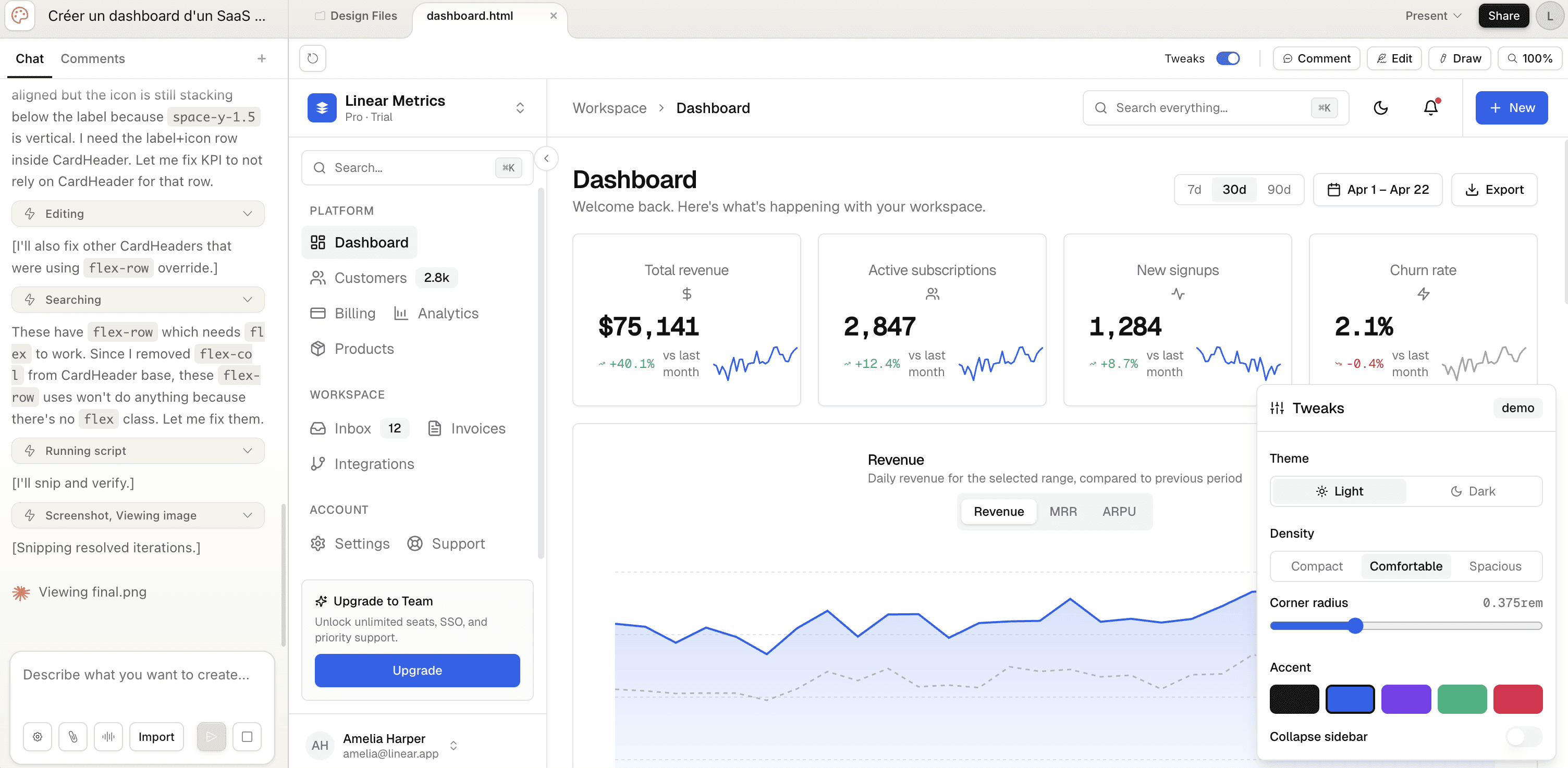 J'ai testé avec une maquette d'application SaaS : un dashboard analytics avec sidebar, graphiques et tableau de données. En deux prompts (description initiale + un ajustement), j'avais quelque chose de suffisamment propre pour le montrer à un client ou un investisseur.